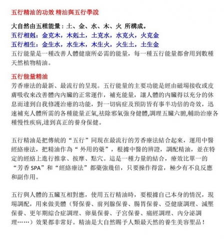 五行與人體的五臟互相對應,使用五行精油時,要根據自己本身的情況,現場調配,用來做美體(腎保養、前列腺保養、腸胃保養、亞健康調理、減壓保養、更年期綜合症調理、卵巢保養、子宮保養、痛經調理、內分泌調理……)效果都非常好。精油是大自然賜予人類最天然的養生美容聖品!